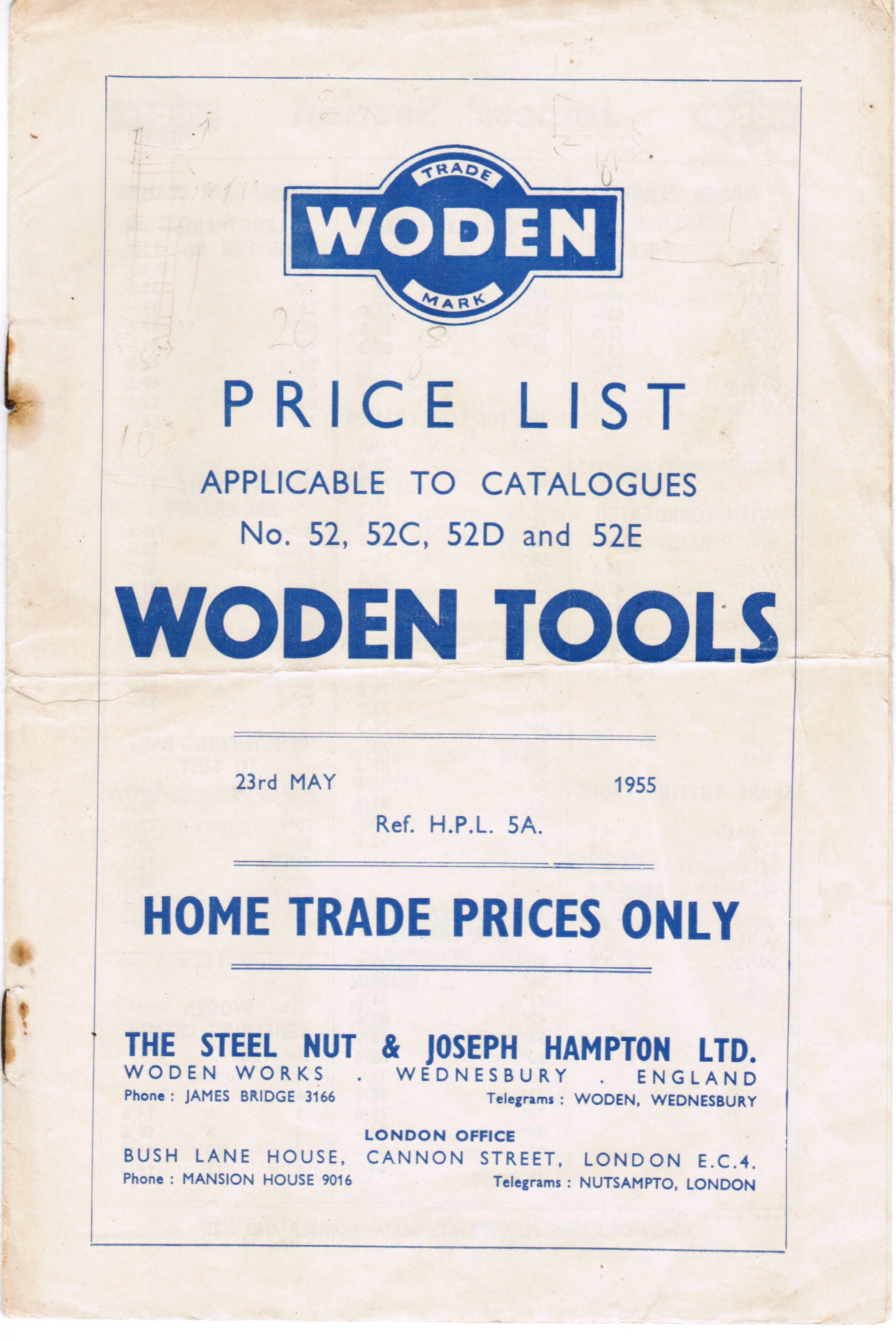 | 1930's 40's and 50's:With The Companys approval as an Air Ministry supplier;producing finished metal components to Admiralty specifications; iron and non-ferrous metal castings for the Marine Industry; it is likely that it was heavily involved in production for the war effort between 1939 and 1945. As in the First World War, this could have included munitions. It is likely that hand tool production was restricted to that required by essential users only and pre-war lines were not generally available to tool shops. After WWII, like other tool manufacturers, The Company struggled to return to normal production due to labour, fuel and material shortages, among other reasons, as noted in the introduction to the 1946 Interim Catalogue. Similar notes were promulgated by other tool manufacturers in the immediate post war period. In 1951, with the publication of catalogue 52, The Company announced improved production from its re-built Woden factory. Woden branded tools were available from tool shops, but The Company did not advertise direct to amateur woodworkers until 1953. Throughout 1953, an advertisement featured the No.189 pattern woodworking vice plus steel sash and T-bar cramps. A newly introducted line of metal handplanes was advertised from February 1954 and a wider variety of tools from 1955. 1956 saw the introduction of several new lines of joiners cramps and it was about this time that the widest range of tools was on offer. In addition to planes, there were several patterns of sash, veneer and G-cramps; six woodworkers vices; and about a dozen engineers or pipe vices . Towards the end of the 1950's. and early 60's., new tool patterns were aimed at the DIY market and some were made using die cast alloy. Despite selling some excellent and competitively priced tool lines, Woden Tools Ltd. was taken over by Record in early 1961. The parent company (Steel Nut & Joseph Hampton Ltd.), continued with its iron & steel core products business until 1965 when it was acquired by F H Tomkins (Holdings) Ltd. | |||||||||||||||||||||