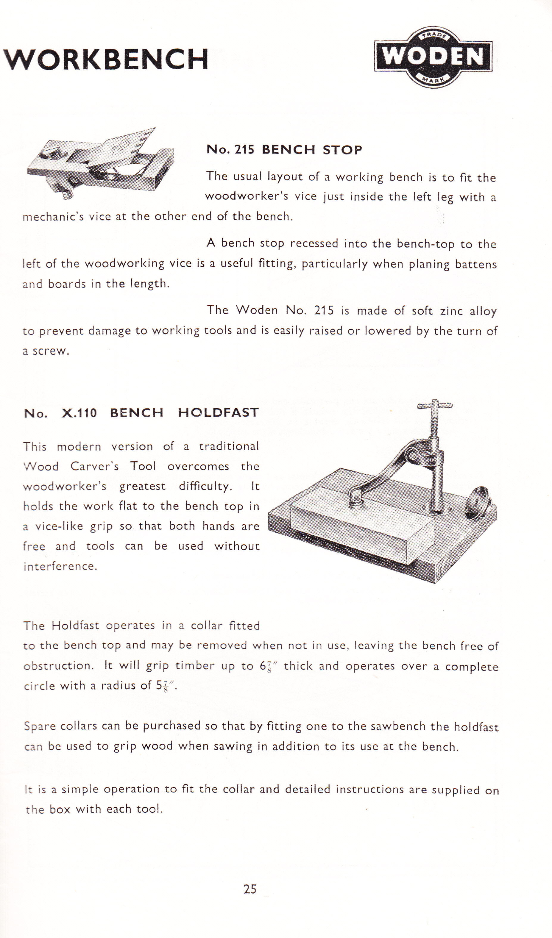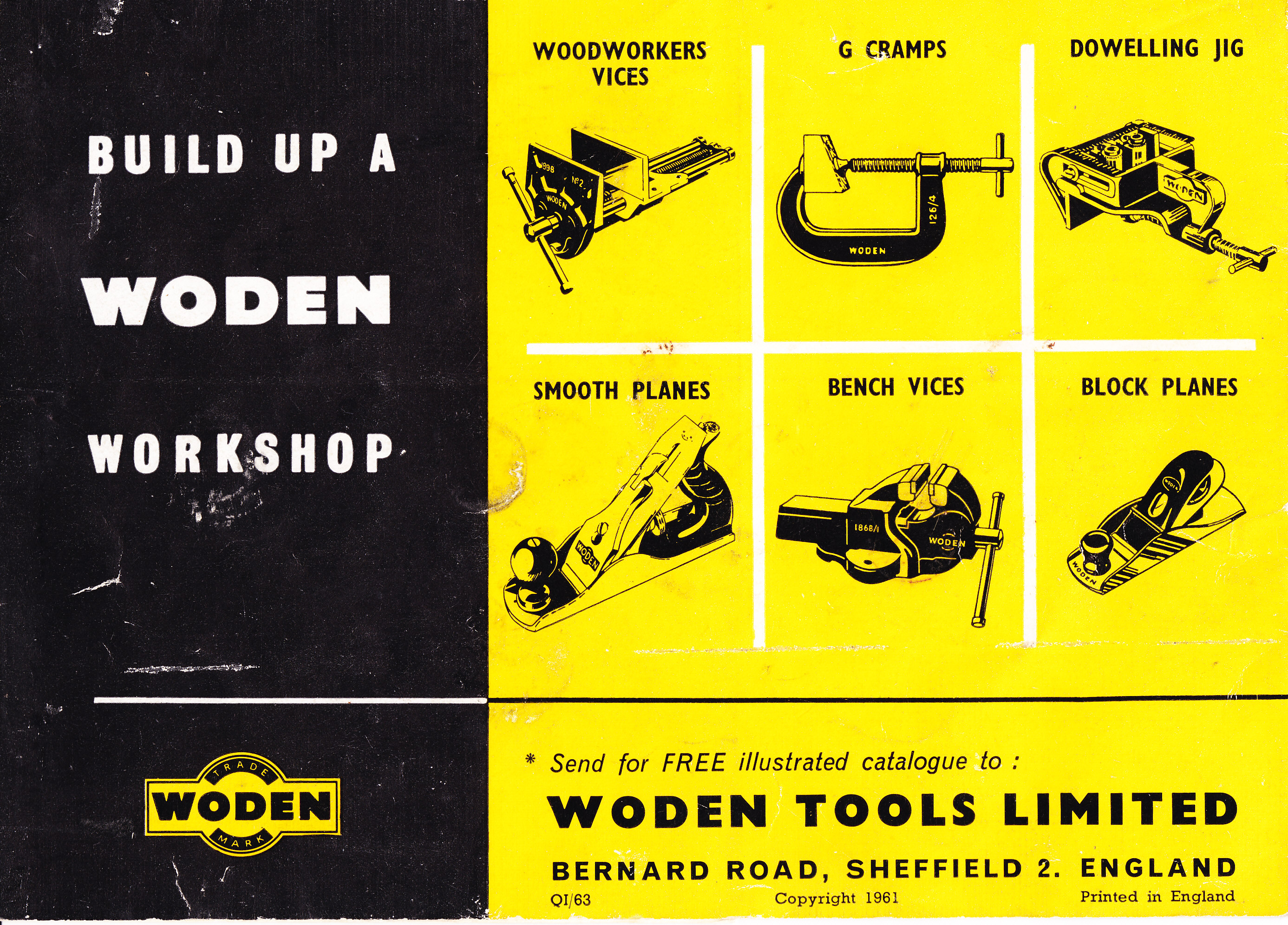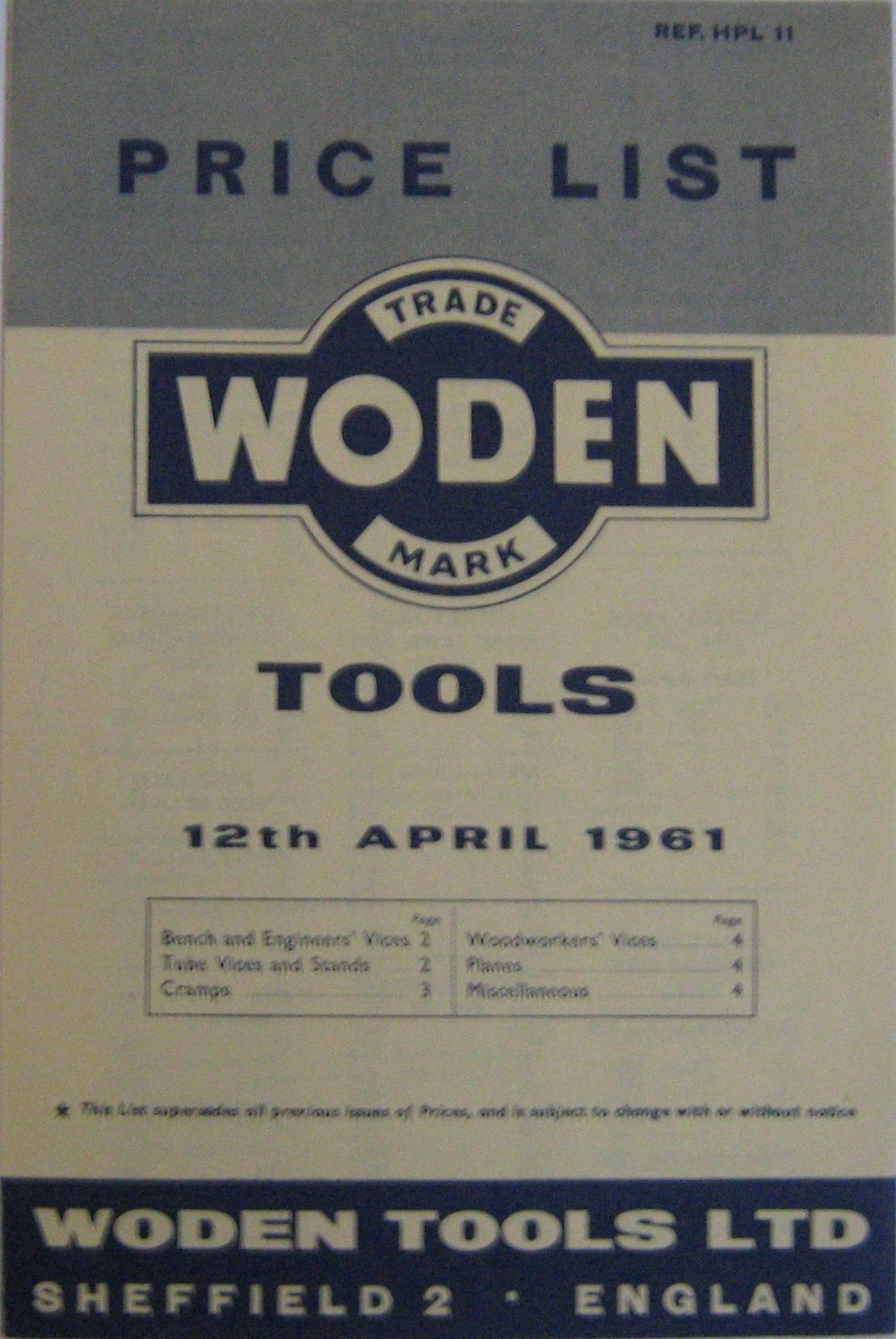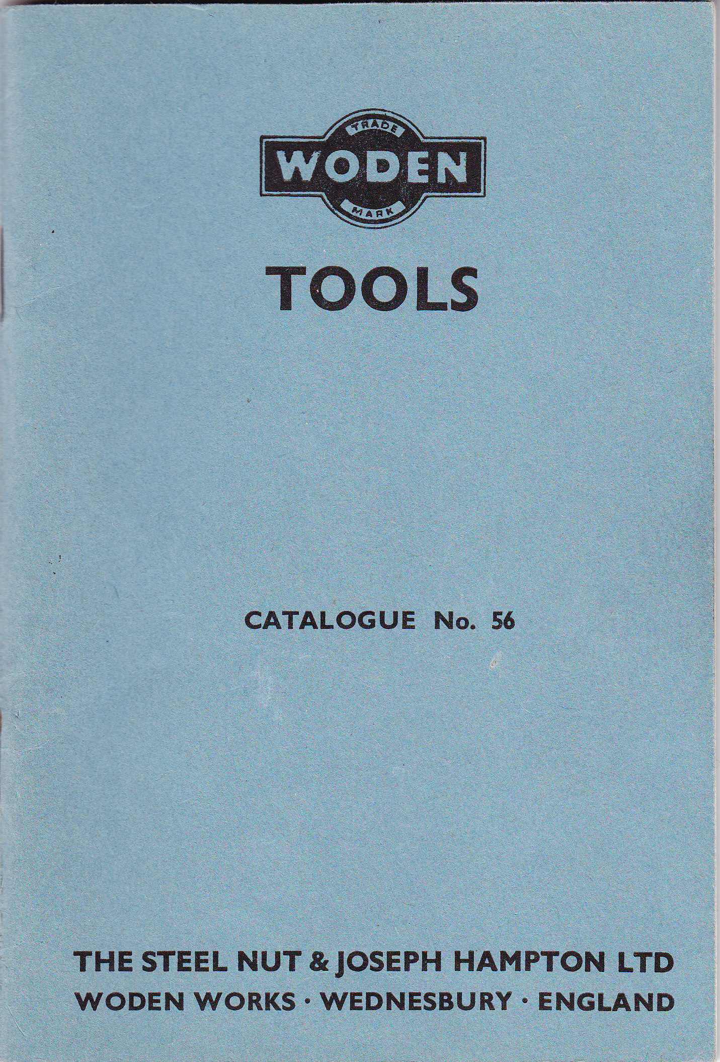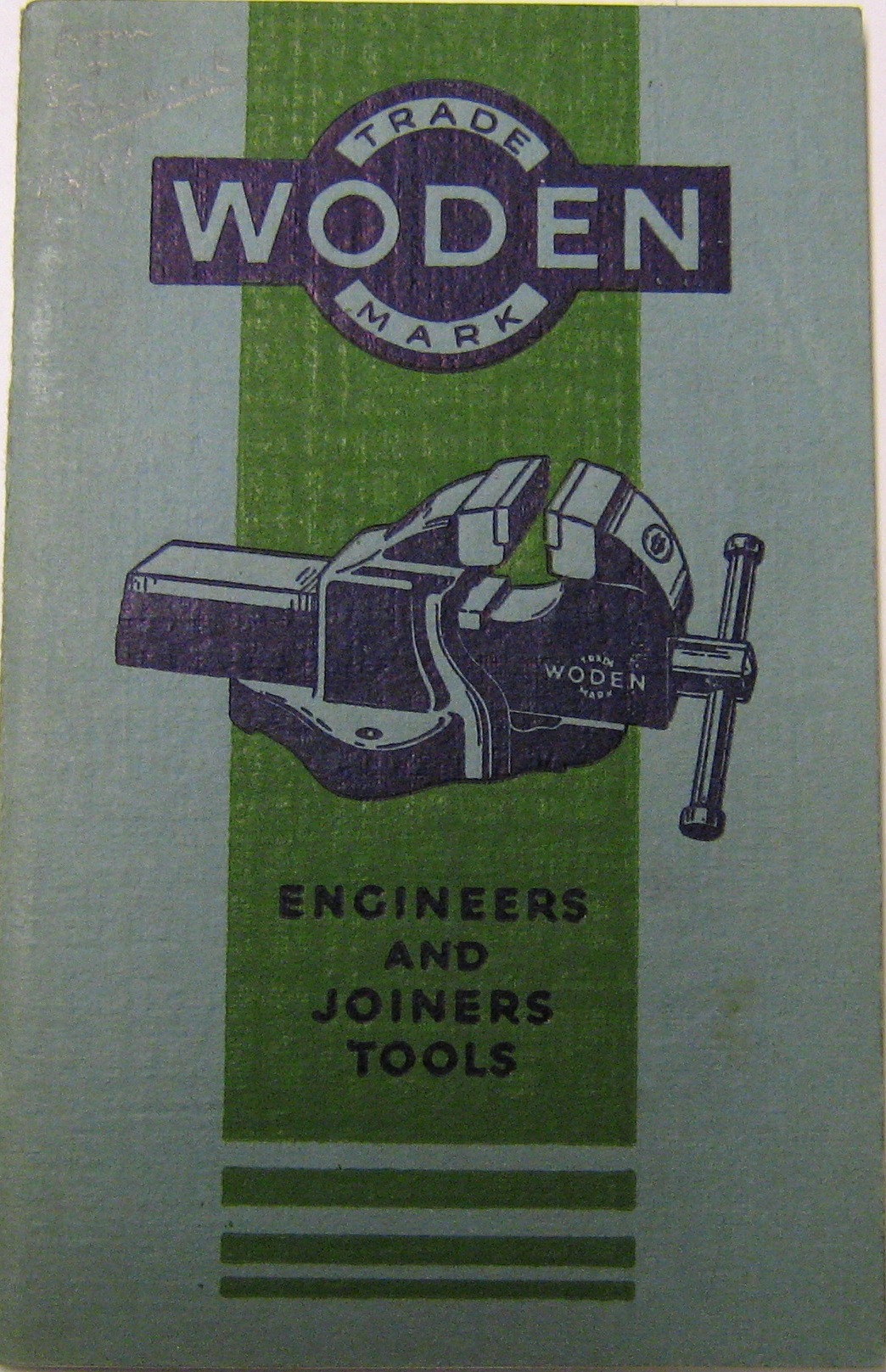 From 1938 catalogue 1898 Amalgamation with Joseph Hampton, Toolmaker, of Wednesbury, Staffs. 1914 Specialist Tool Division, making vices, cramps, Joiners and Engineers tools 4) 1920 and 1927 Illustrated catalogues of Engineers and Joiners Tools issued. 1937 GB and USA Patents granted for “Improvements relating to vices” Woden “Ideal Action” Engineers and Woodworkers vices in production; Stand at British Industries Fair, Birmingham 4). 1938 Ebonising introduced as a protective finished on steel parts. 1939 Supplier to The Admiralty, War Office, Air Ministry and Aviation Industry; . 1946 Hand tool manufacture resumes; 1951 Re-built Woden Factory in production; 1952 Acquires W.S. Manufacturing, Birmingham, maker of hand planes and other tools; 1953 GB Patent granted “Improvements in quick release vices” Woden Ideal Quick Action 1954 Introduces Woden rebate, bench and block planes; Booklet No. 52d issued. 1955 Booklet/Catalogue 52E issued; 1956 Catalogue No. 52E re-issued; No. 126 14 inch G-cramp available; “Tower Jack” and lever Catalogue No. 57 issued; X251 machine Floor cramps geared patterns 142B and 143B dis-continued; Commenced selling some lines of un-catalogued (factored) tools via representatives, 1958 Catalogue No. 58 issued; Further GB800885 patent granted “Improvements in or relating to vices” (for A120/A122); Introduces pushpin I (X170); No. 95 machine vice dis-continued. 1960 Catalogue No. 60 issued; X180 QUIKSAW introduced; Larger sized pushpin II (X171) introduced; Introduces Woden wallplugs in a range of sizes (Z106 to Z114); A120 and A122 woodworkers vices dis-continued and replaced with the A130 rapid action Woodworker’s vice incorporating the American Wilton patent, (GB819506); 1961 X190 dowelling Jig introduced; X172 Tack introduced; Woden Tools Ltd. Taken over Tools) of Sheffield 7); Catalogue No.60 re-issued. 1962 Catalogue Cat.30 issued. A130 rapid action woodworkers vice re-designated X130; and grooving attachment for power drills. 1967 Catalogue Cat.31 re-issued. 1968 Catalogues WF.1 (thrice) and W1 issued. 1969 (01 September) Last known reference to Woden Tools in price list HPL15 (Cats. 31 and W1). | |||||||||||||||||||||