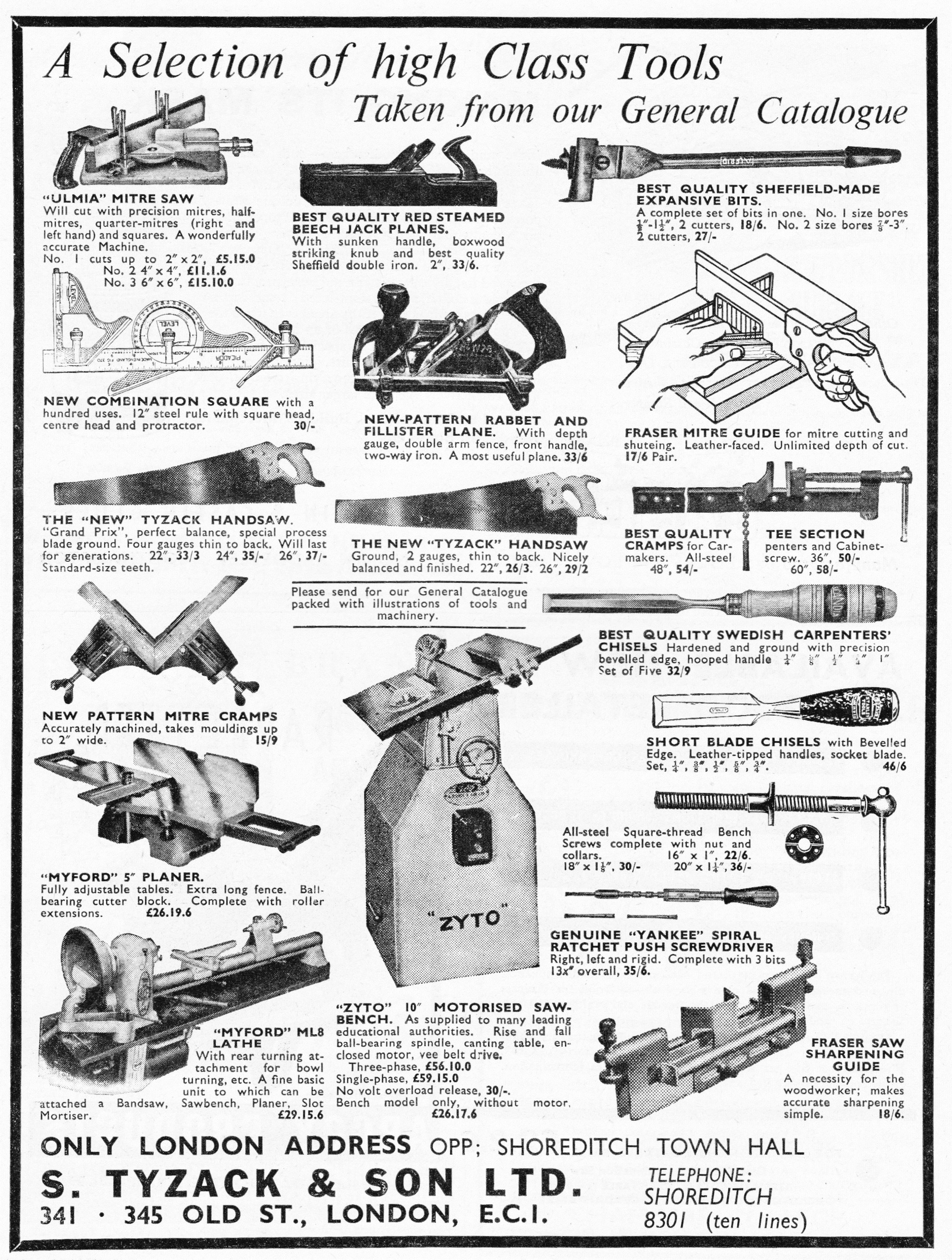 Diary of Events:Whilst the Woden hand plane is the main interest on this site, the manufacture of other excellent Woden hand tools cannot be ignored.With this in mind, the following diary of events has been compiled, relating to the manufacture and supply of hand tools throughout the history of Woden Tools, but concentrating on Post War production. The diary and the other notes which follow could not have been compiled without reference to the archives at The Hawley Collection in Sheffield. Thanks to Mr Ken Hawley M.B.E. and his volunteer Staff, for permitting access to these records and permitting some images to be copied. Other references are noted at the foot of this document. ![]() From 1938 catalogue ![]() Woden tools 1953